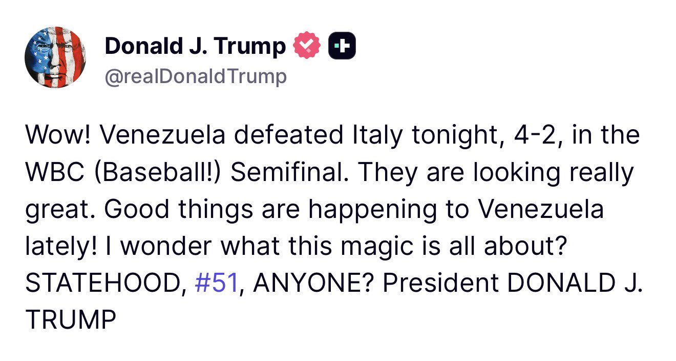 “Wow! Venezuela defeated Italy tonight, 4-2, in the WBC (Baseball!) Semifinal. They are looking really great. Good things are happening to Venezuela lately! I wonder what this magic is all about? STATEHOOD, #51, ANYONE?," reads Trump’sTruth Social post.